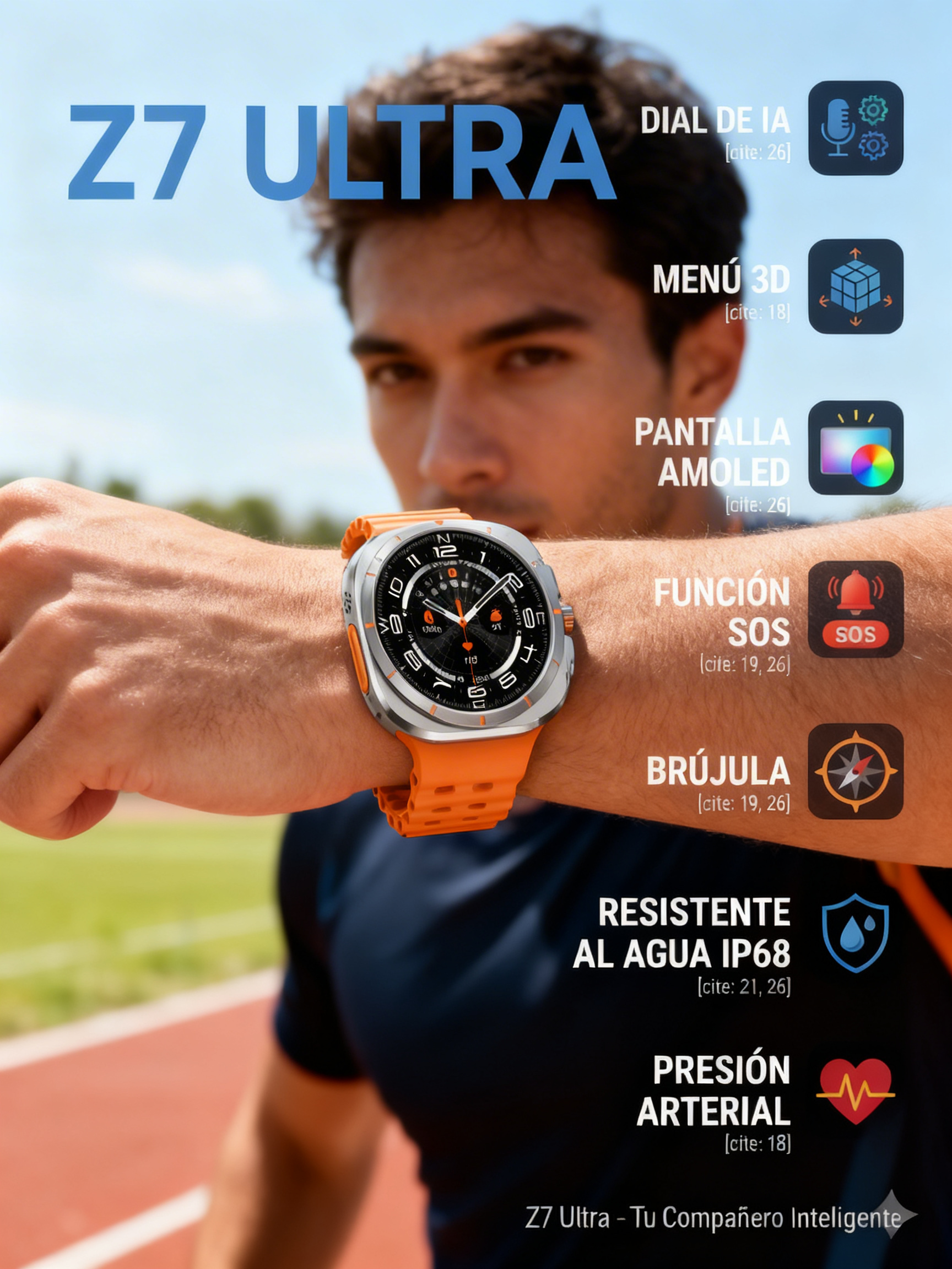 Lleva tu día al siguiente nivel con el Smart Watch Z7 Ultra 47mm AMOLED. Un reloj inteligente con diseño moderno, pantalla impresionante y funciones que te acompañan en cada momento.Disfruta de una pantalla AMOLED de 47 mm ultra nítida, monitoreo de actividad física, notificaciones de llamadas y mensajes, además de múltiples funciones que te ayudan a mantenerte conectado y activo todo el día.